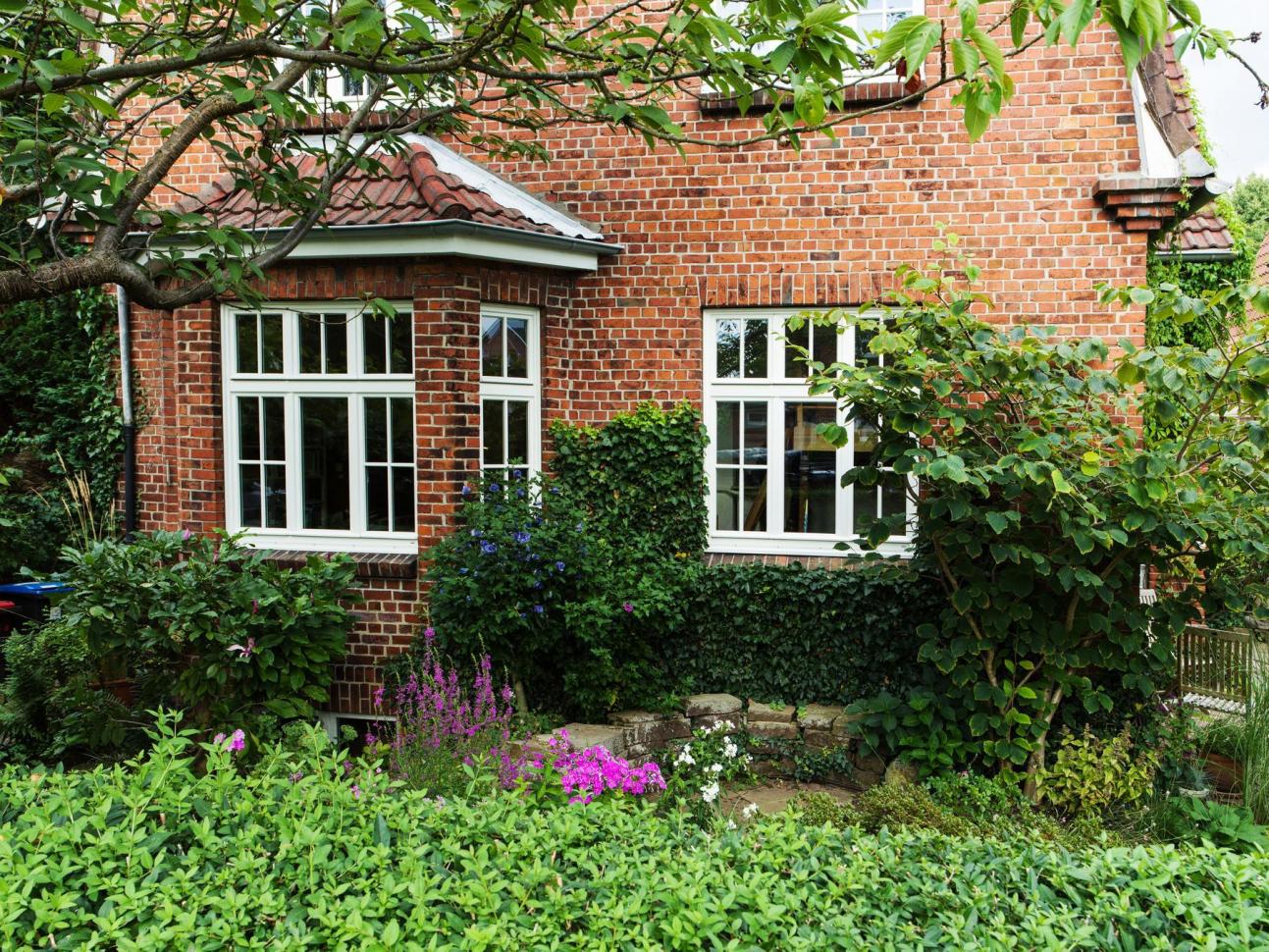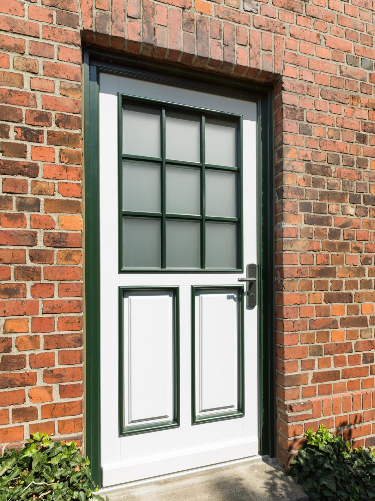 Die Entscheidung fiel auf eine hochwertige Haustür von PaX Classic, die durch ihre klassische Gestaltung mit Sprossenverglasung im oberen Bereich und massiven Füllungen im unteren Bereich perfekt zum Baustil der damaligen Zeit passt. Solche Türformen waren insbesondere im Reform- und Heimatstil um 1900 weit verbreitet und prägen bis heute viele bürgerliche Wohnhäuser und Stadthäuser in Norddeutschland.