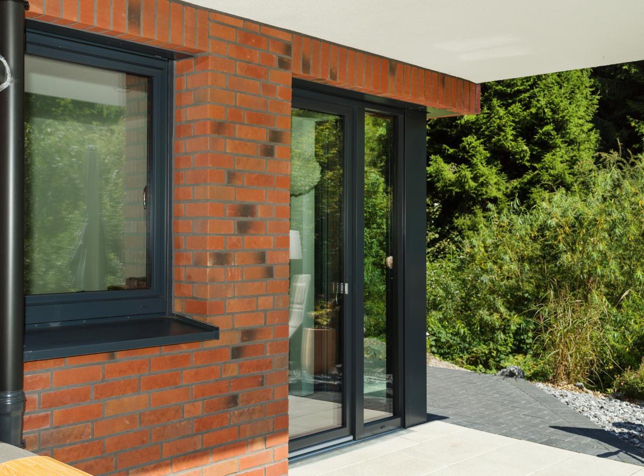Für die Fenster- und Türelemente fiel die Wahl auf hochwertige Kunststofflösungen von PaX in einem eleganten Dunkelgrau. Die Kombination aus Fenstern, Balkontüren und großzügigen Hebeschiebetüren sorgt für helle, lichtdurchflutete Räume und eröffnet weite Ausblicke in die naturnahe Umgebung. Gleichzeitig bieten die verbauten Elemente hervorragende Wärme- und Schalldämmung sowie ein hohes Maß an Sicherheit.