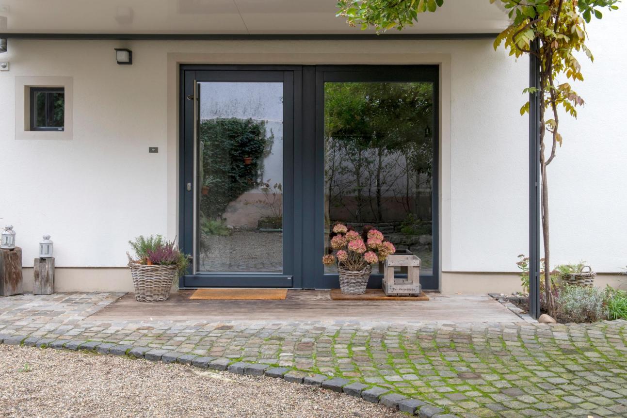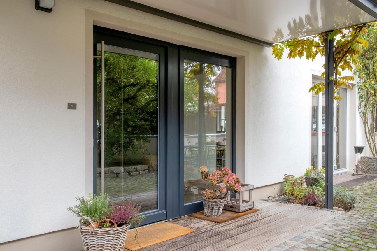 PaXpremium-Holzhaustür mit viel Glas & anthrazitgrauem Rahmen in Wiesbaden, fachgerecht umgesetzt durch Okaty-Hachenberger GmbH.