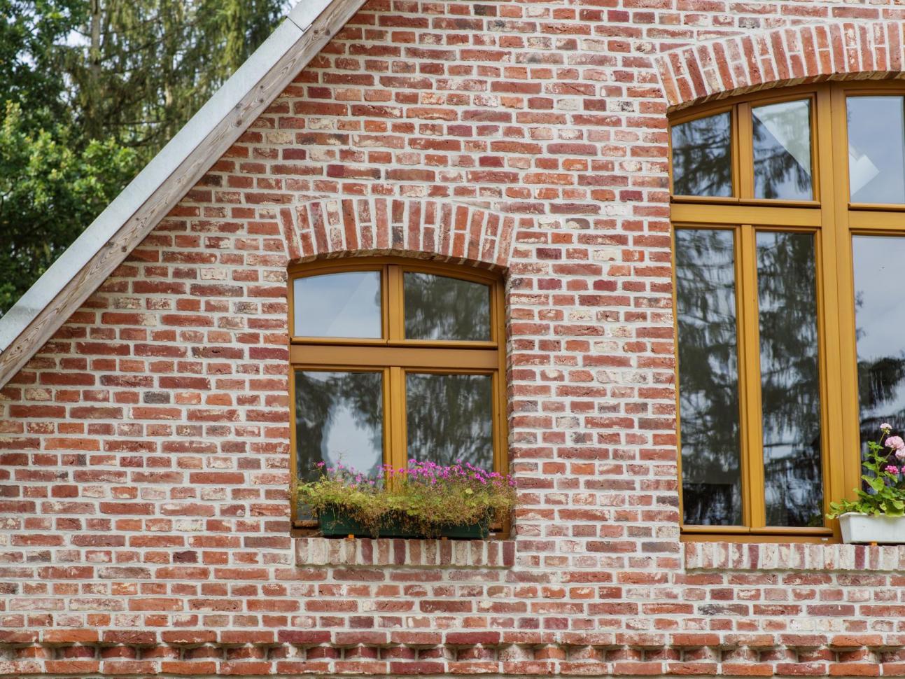Historisches Bauernhaus in Schneverdingen: PaXretro-Holzfenster mit Stichbögen & Restaurierungsglas, Montage durch Tischlerei Peters.
