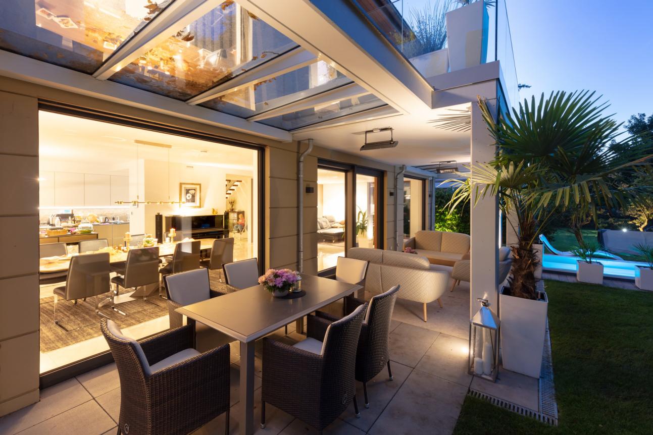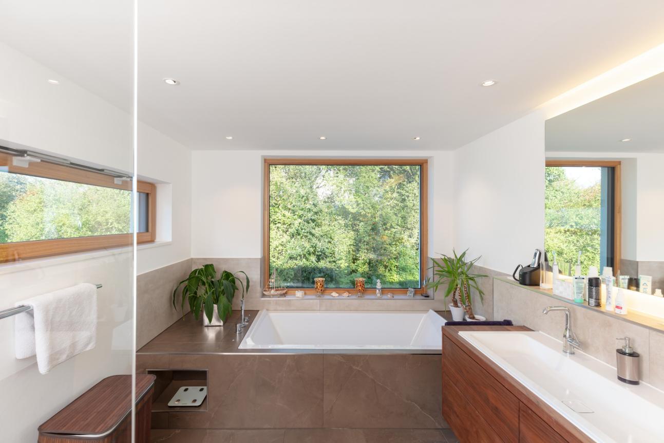 Bei einer neu gebauten Stadtvilla mit Poolanlage in Nordrhein-Westfalen wurden Holz-Aluminium-Fenster von PaX eingesetzt. Die äußere Aluminiumschale ist in der matten Feinstrukturfarbe DB703 metallic hochwetterfest ausgeführt. Im Innenbereich sorgt eine Afzelia-Lasur auf Eucalyptus globulus-Holz aus nachhaltigem Anbau in Spanien für hohe Wertigkeit. Viele Fenster- und Türsysteme erhielten eine einbruchhemmende Ausstattung gemäß Widerstandsklasse RC2, um zeitgemäße Sicherheit zu gewährleisten. Zum Einsatz kamen verschiedene festverglaste Bereiche, Balkontüren und großflächige Hebe-Schiebe-Türen. Beratung, Aufmaß und Montage erfolgten durch die Firma Brandenstein Bauelemente.