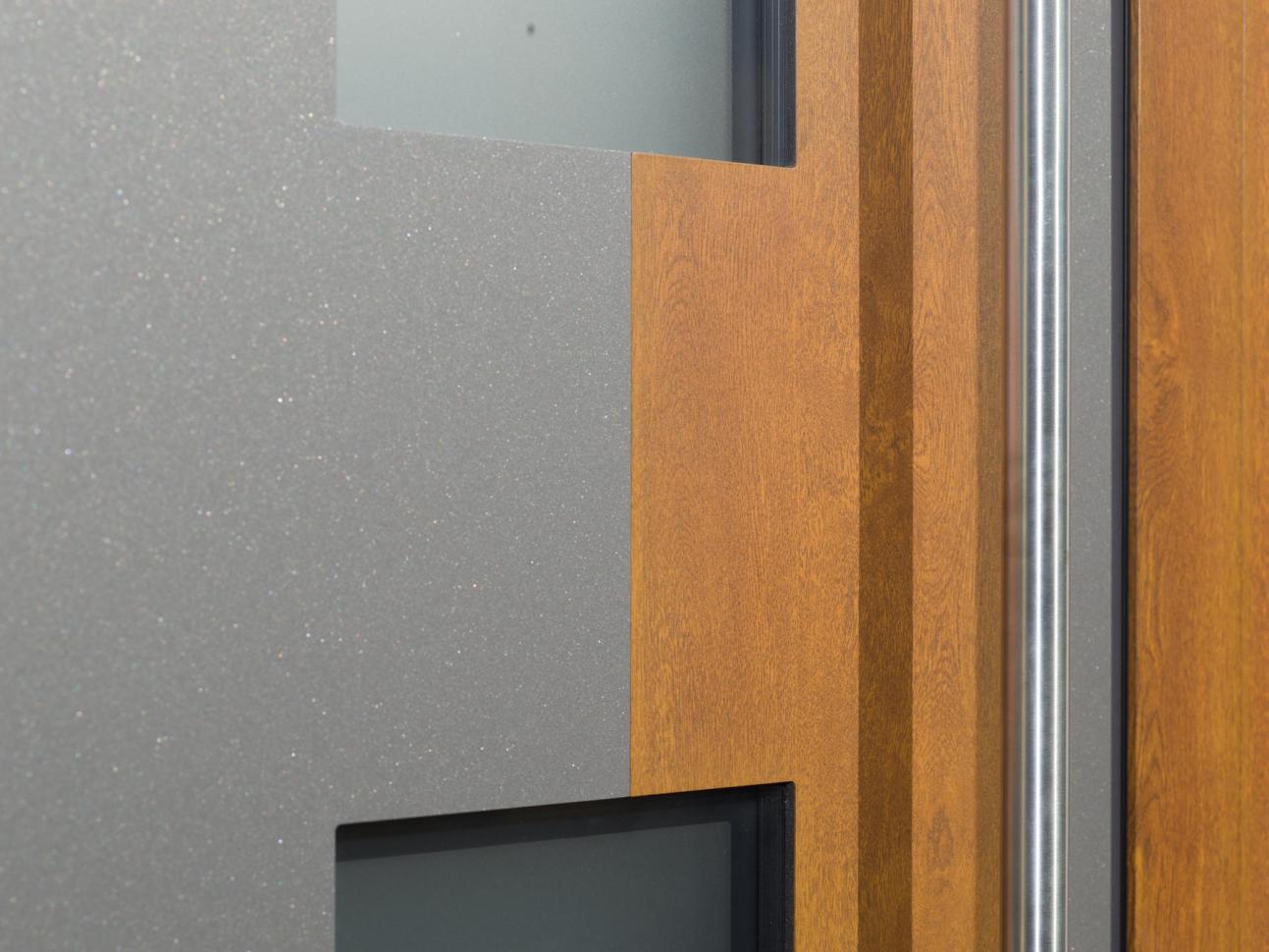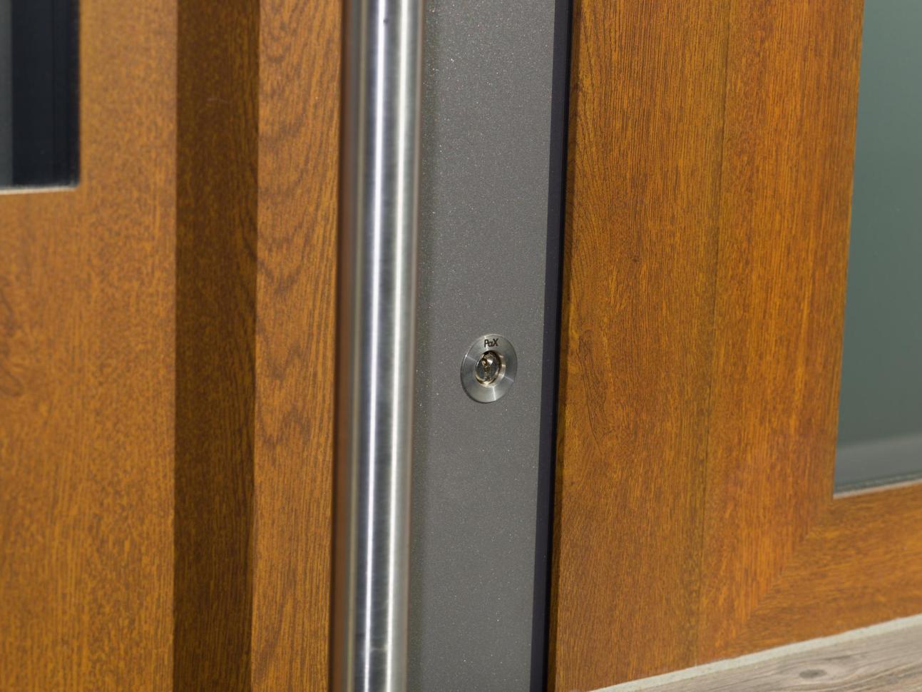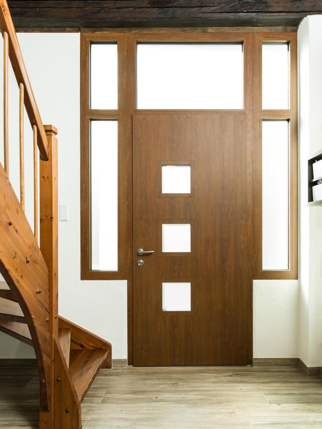Für ein charmantes Reihenhaus in Fachwerkbauweise in Ingelheim lieferte PaX eine elegante PaXentrée Aluminium-Haustür mit Seitenteilen und Oberlicht. Die eingesetzte satinierte Verglasung sorgt für viel Tageslicht, ohne auf Privatsphäre zu verzichten. Die Haustür besticht durch eine hoch­wetter­feste Holzdekor-Oberfläche im Farbton Golden Oak, kombiniert mit Grau-Aluminium Metallic, ebenfalls in hochwetterfester Ausführung. Ein abgerundeter Stangengriff unterstreicht das hochwertige Design. Seitenteile und Oberlichtrahmen greifen das Golden-Oak-Dekor harmonisch auf. Dreifachverglasung gewährleistet eine hervorragende Wärmedämmung, während die Fünffachverriegelung für zuverlässige Basissicherheit sorgt.