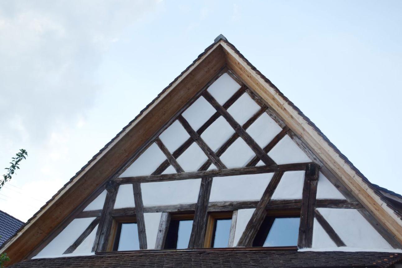 Fachwerk im Giebel zu verglasen ist ein sehr sensibles und strittiges Thema in der Denkmalpflege. Oft entstehen dabei nicht reversible Schäden an der Bausubstanz. Auf Anraten von PaX Classic entschied sich die Bauherrschaft deshalb für einen sehr behutsamen Weg. Hinter dem Giebel wurde ein dreiflügeliges Fensterband eingebaut. Die Holzbalken als auch die gefüllten Gefachungen wurden nicht angetastet, denn einige Fächer waren bereits leer oder mit Klappen versehen.