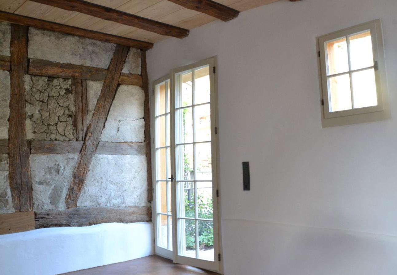 Die Raumaufteilung im Erd- und Obergeschoss beließen die neuen Eigentümer wie gehabt. Lediglich die Nutzung sollte sich ändern. Aus dem früheren Kelterraum im Erdgeschoss entstand ein besonderer Wohnraum mit hohen Decken, Stampflehmboden und direktem Zugang zum reich bepflanzten Garten. Im Obergeschoss wurde die Sommerstube samt historischem Ofen aus dem 19. Jahrhundert wieder in den ursprünglichen Zustand versetzt. Eine Besonderheit war die Oberfläche der Wandtäfer. Sie waren im Farbton „ultramarinblau“ bestrichen, der nachweislich erst seit 1830 herstellbar ist.