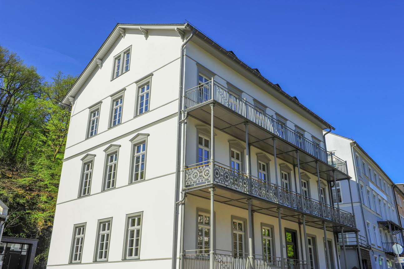 Das Rathaus wurde um die Mitte des 19. Jahrhunderts als Kurhotel gebaut, ehemals „Russischer Kaiser“, dann „Kaiserhof“, später auch „Parkhotel“. Zunächst zweigeschossig konzipiert wurde es kurz vor der Jahrhundertwende um ein drittes Obergeschoss erweitert. Es ist das letzte noch erhaltene Gebäude in der Tradition der zunächst in Holz, später in Gusseisen errichteten Wandelgänge und Hallen, die ein besonderes Merkmal der Kurbäder im 18. und 19. Jahrhundert darstellen. 2015-2017 erfolgte eine umfangreiche Sanierung des gesamten Gebäudes,  gerade auch auf die originalgetreue Wiederherstellung der äußeren Futter und Bekleidungen wurde sehr viel Wert gelegt.